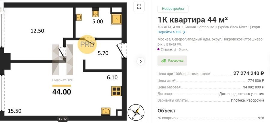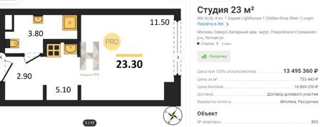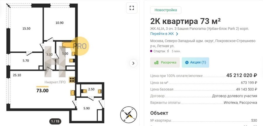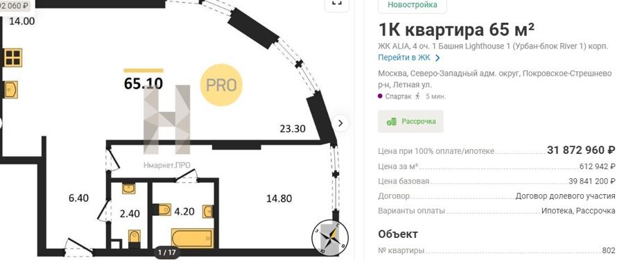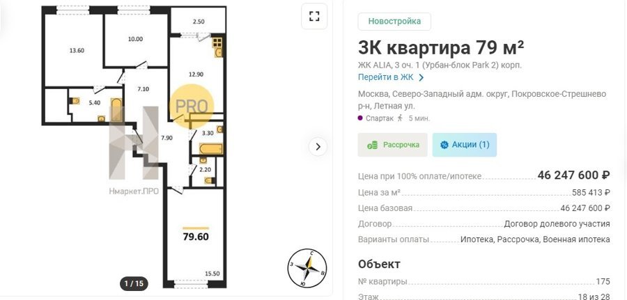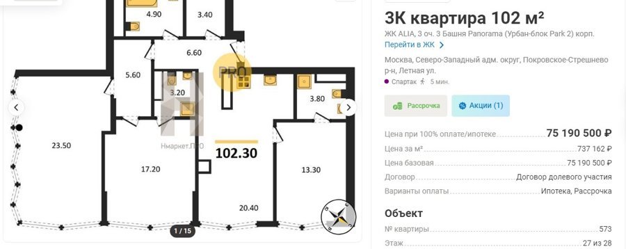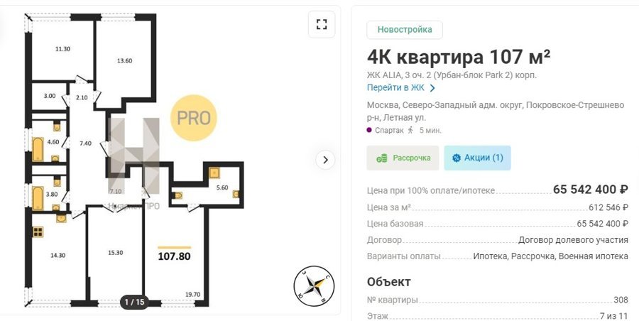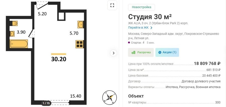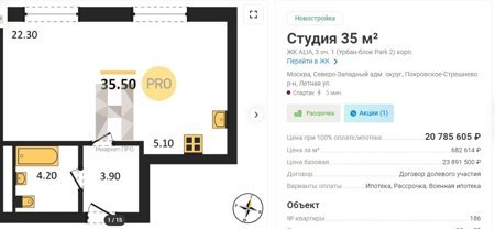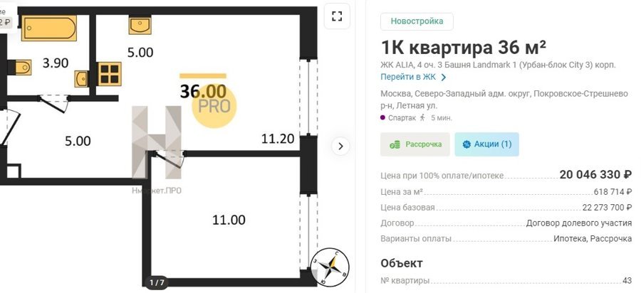 ПВ от 20%, ежеквартальные платежи по 5%, остаток выплачивается через год. Возможно предоставление скидки — 6%.